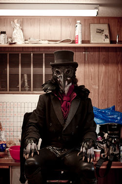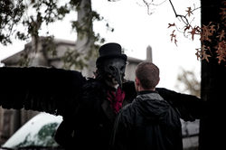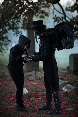 ALINA DASHES THROUGH THE GLOOMY CEMETERY, FLEEING FROM THE VOICES OF SLANDER THAT MATERIALIZE IN THE FORM OF A RAUM, A DEMONIC CROW-HEADED MAN.
